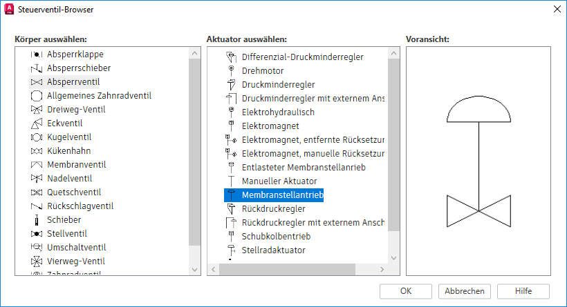 Im überarbeiteten Steuerventil-Browser werden jetzt separate Symbole für sämtliche Ventilkörper- und Aktuatorklassen dargestellt. Sobald ein Körpertyp und ein Aktuatortyp aus den Auswahllisten gewählt werden, erscheint zudem eine kombinierte Vorschau des resultierenden Steuerventils.